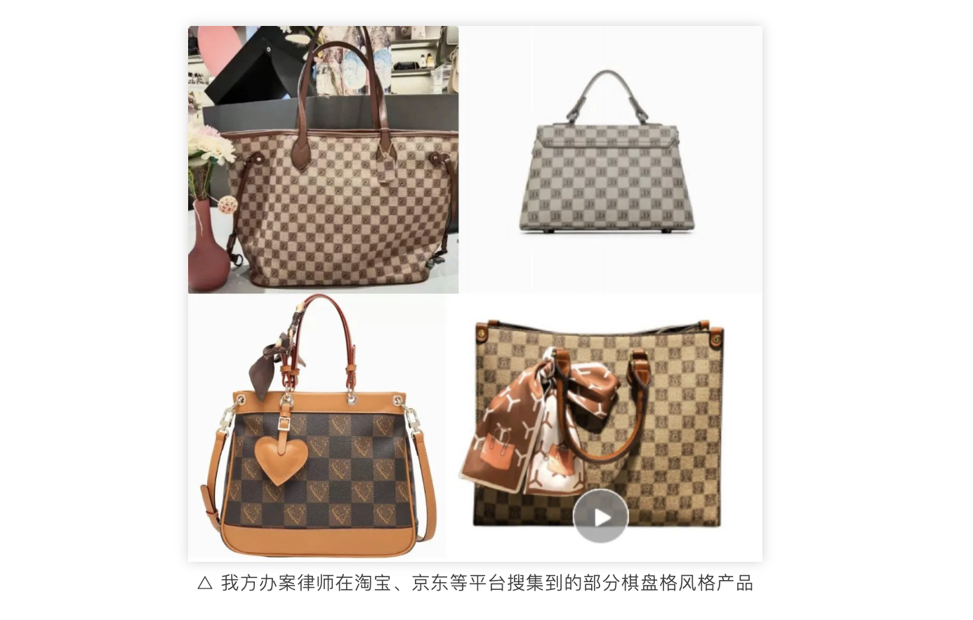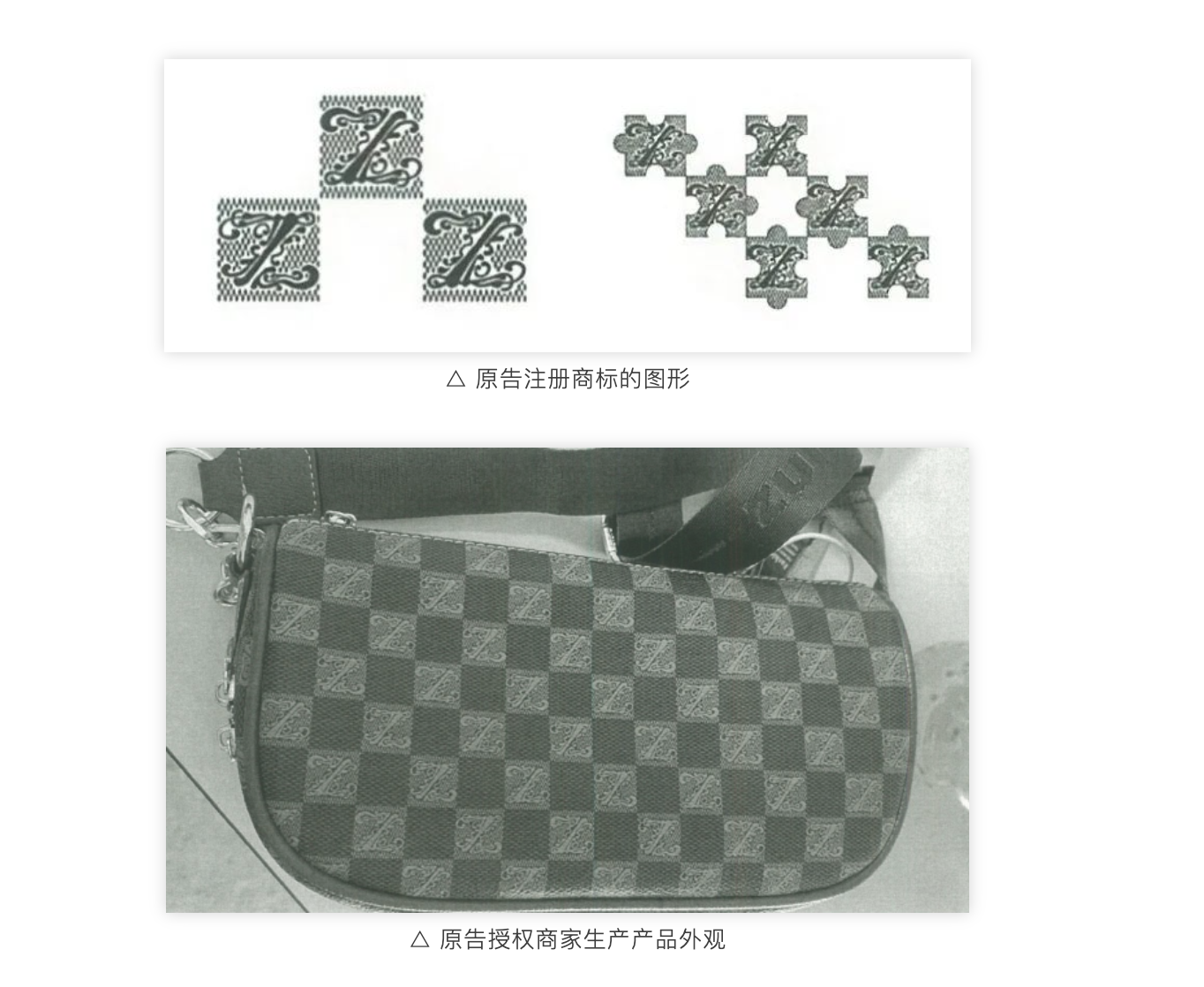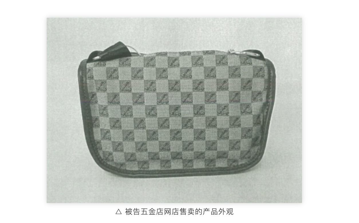 說回這個案子。單看兩個圖形,可以認定五金店產品上的圖形與原告的商標構成了近似商標。但以上兩個產品圖片中的棋盤格風格的包,它們的外觀最明顯的特征,您覺得是格子中“Z”和“L”這樣的字母,還是重復、棋盤式的排列方式?