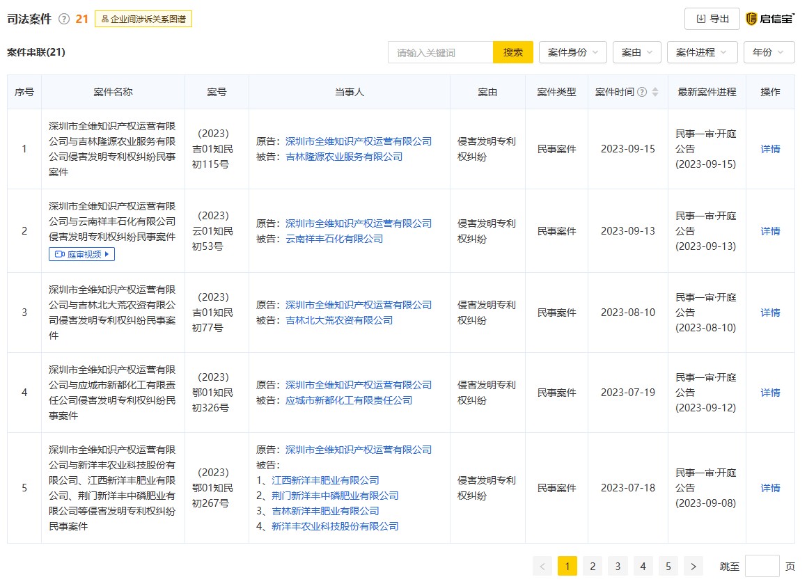 另據(jù)啟信寶公開信息顯示,深圳全維公司涉及司法案件21件,多為侵害發(fā)明專利權(quán)糾紛;涉訴關(guān)系23個,對方多是與化肥生產(chǎn)相關(guān)企業(yè)。
