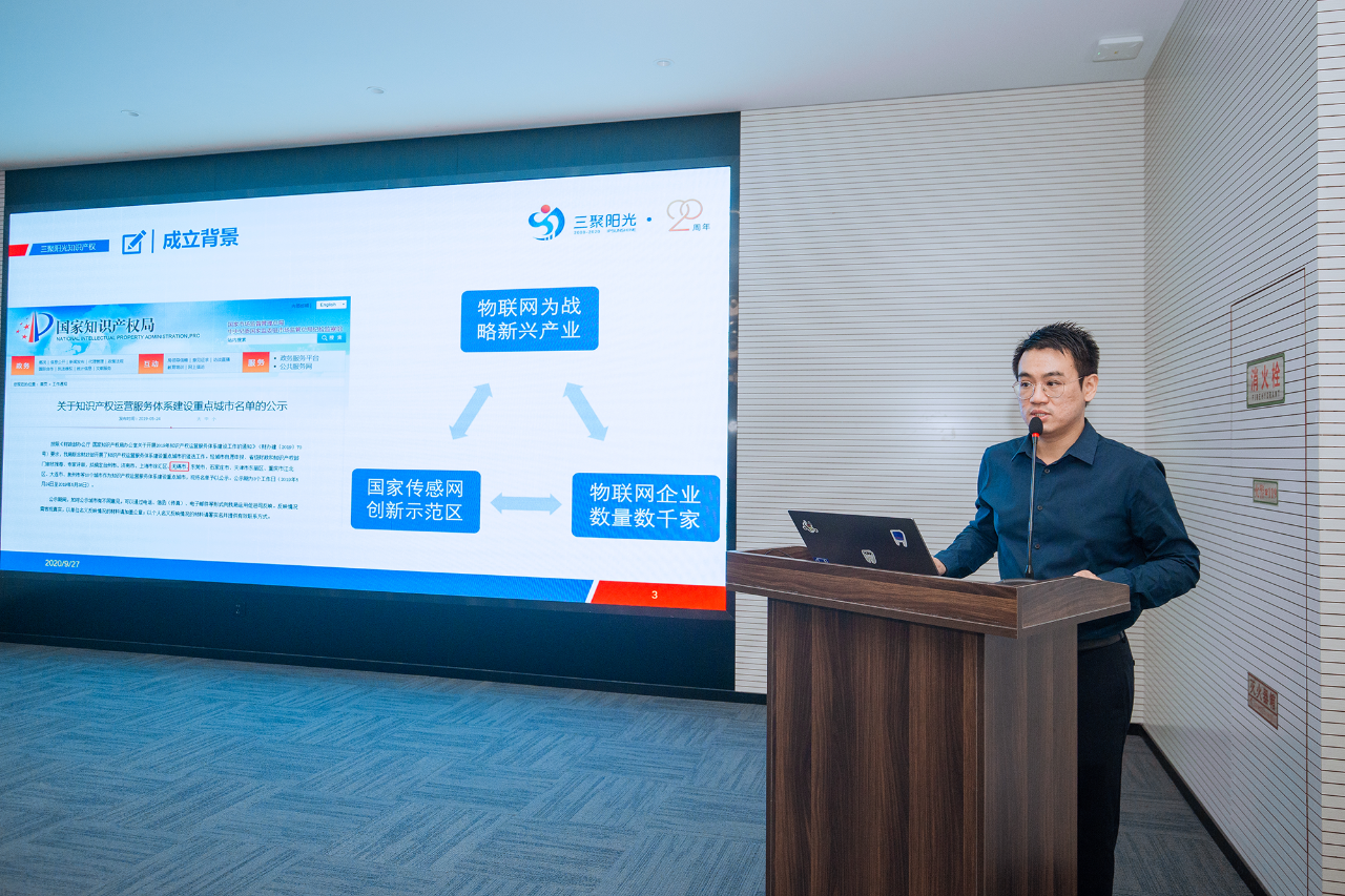 在調(diào)研座談會(huì)上,雷筱云司長(zhǎng)聽(tīng)取了三聚陽(yáng)光華東區(qū)副總經(jīng)理鞏琦關(guān)于平臺(tái)建設(shè)情況及服務(wù)職能的匯報(bào)。鞏琦介紹,無(wú)錫市物聯(lián)網(wǎng)產(chǎn)業(yè)知識(shí)產(chǎn)權(quán)運(yùn)營(yíng)服務(wù)平臺(tái)由無(wú)錫三聚陽(yáng)光知識(shí)產(chǎn)權(quán)服務(wù)有限公司承建,在三年建設(shè)期屆滿將建設(shè)成為集展示、咨詢、托管、評(píng)估、運(yùn)營(yíng)等功能于一體的綜合性知識(shí)產(chǎn)權(quán)運(yùn)營(yíng)服務(wù)平臺(tái)。屆時(shí),線上運(yùn)營(yíng)內(nèi)容將包括知識(shí)產(chǎn)權(quán)交易、數(shù)據(jù)分析、知識(shí)產(chǎn)權(quán)貫標(biāo)輔導(dǎo)、產(chǎn)業(yè)信息平臺(tái)等,促進(jìn)銀企對(duì)接、提供保險(xiǎn)保障;線下運(yùn)營(yíng),將與蘇南國(guó)家自主創(chuàng)新示范區(qū)無(wú)錫高新區(qū)一站式服務(wù)中心緊密合作,推進(jìn)物聯(lián)網(wǎng)技術(shù)交易,開(kāi)展相關(guān)主題活動(dòng)等。