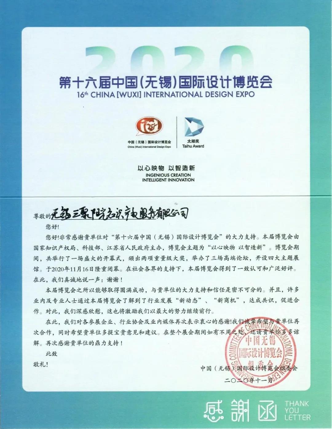 三聚陽光收到無錫國際設(shè)計博覽會組委會感謝信