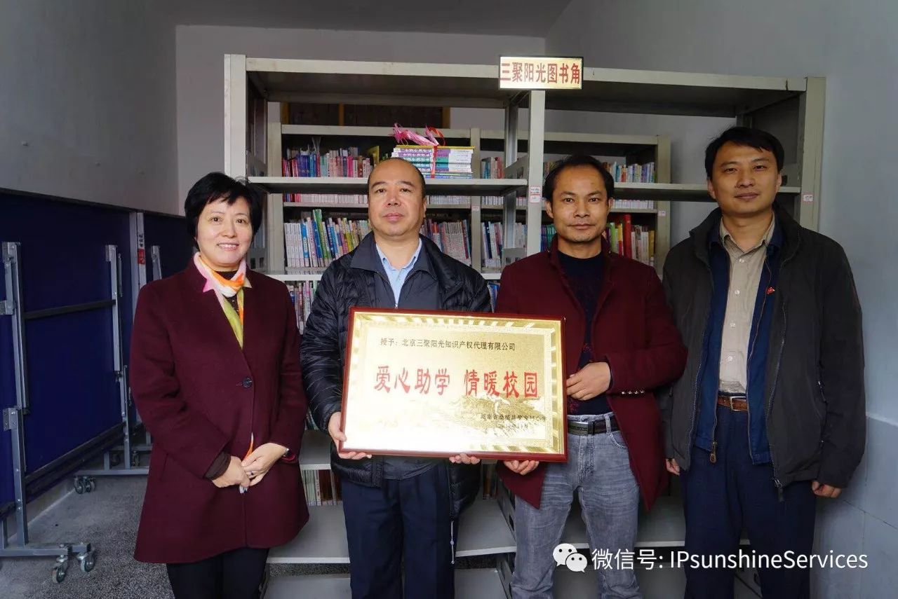 作為全國首批的知識產(chǎn)權(quán)服務(wù)品牌機(jī)構(gòu),三聚陽光此次由副總高東輝親赴桑植,代表公司簽署了《備忘錄》,同時向國家知識產(chǎn)權(quán)局對口幫扶的桑植縣廖家村鎮(zhèn)小學(xué),捐贈了知識產(chǎn)權(quán)及科技類書籍,建立起三聚陽光圖書角。學(xué)校領(lǐng)導(dǎo)特向我司領(lǐng)導(dǎo)贈送了“愛心助學(xué) 情暖校園”的牌匾。