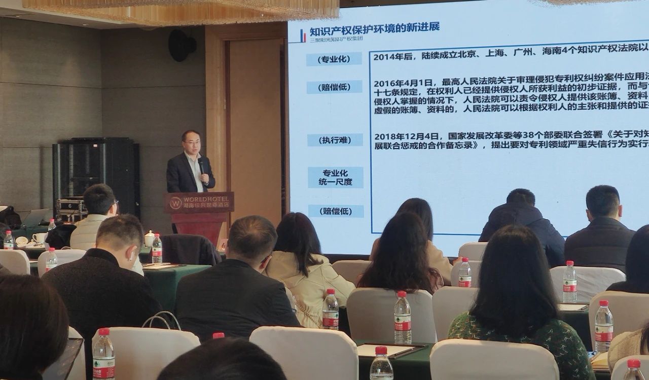 日前,由湖南省知識(shí)產(chǎn)權(quán)協(xié)會(huì)主辦、三聚陽光長沙公司承辦的“企業(yè)國內(nèi)外貿(mào)易中專利訴訟與應(yīng)對(duì)策略研討會(huì)”成功舉辦。國家知識(shí)產(chǎn)權(quán)局原局長、中國知識(shí)產(chǎn)權(quán)研究會(huì)原理事長田力普,湖南省知識(shí)產(chǎn)權(quán)協(xié)會(huì)常務(wù)副理事長、湖南省知識(shí)產(chǎn)權(quán)局原副局長劉躍紅,三聚陽光董事長張杰受邀出席活動(dòng)。三聚陽光總裁張建綱、北京易聚律師事務(wù)所主任律師周美華作主題分享。三聚陽光副總裁朱正強(qiáng)主持研討會(huì)。