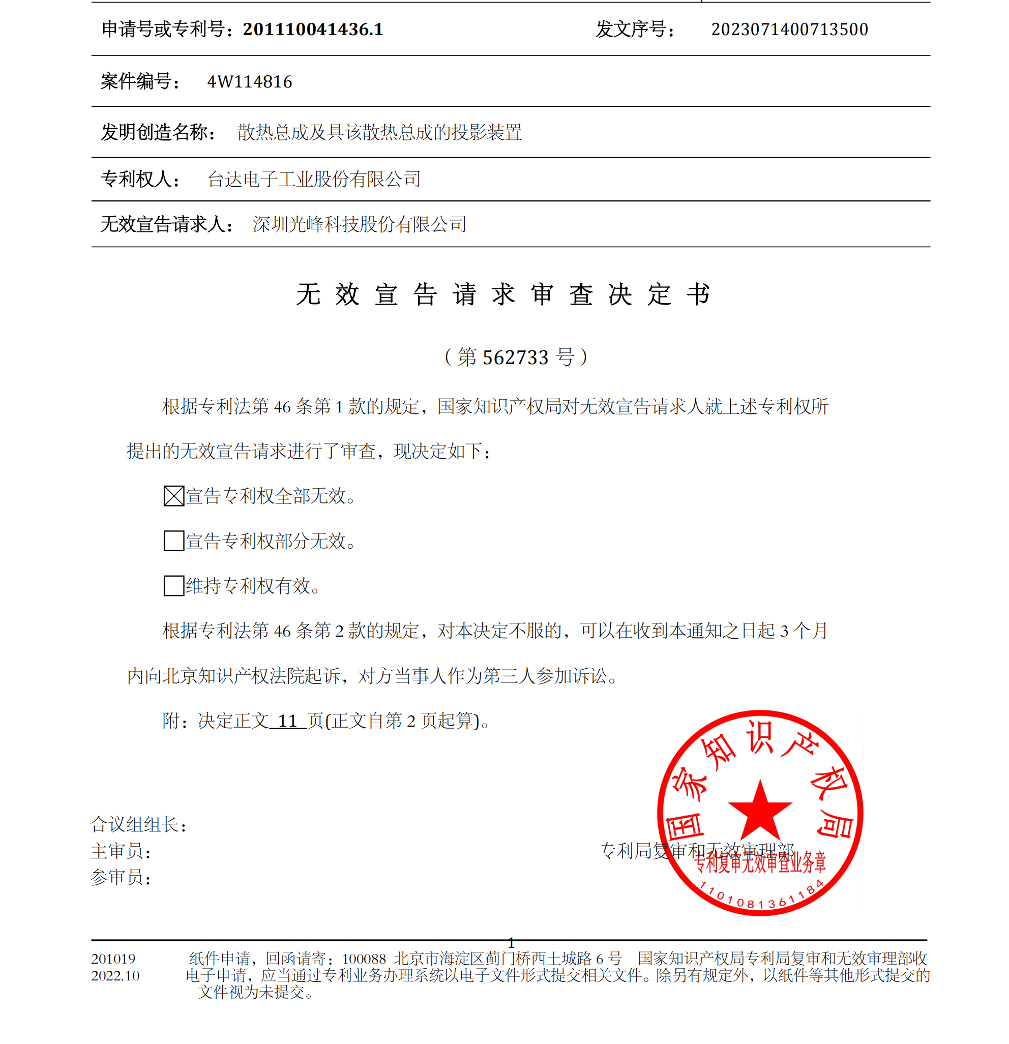 國家知識產權局宣告臺達電子散熱總成投影裝置專利無效