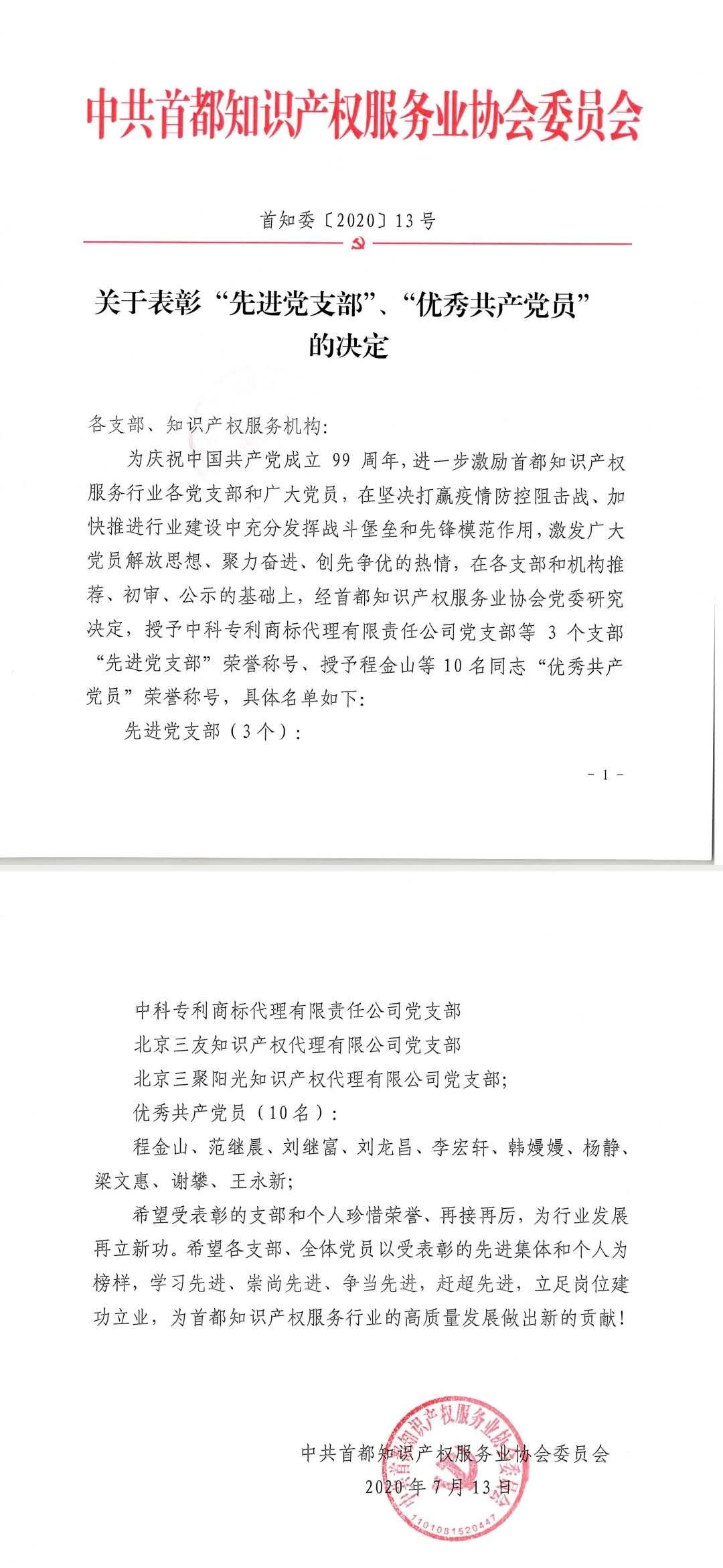 近日,首都知識產(chǎn)權(quán)服務(wù)業(yè)協(xié)會黨委下發(fā)表彰決定,授予北京三聚陽光知識產(chǎn)權(quán)代理有限公司黨支部“先進(jìn)黨支部”榮譽(yù)稱號,以表彰三聚陽光黨支部在支部成立以來,在支部建設(shè)、服務(wù)客戶等方面的突出成績,特別表彰疫情防控阻擊戰(zhàn)打響以來,帶領(lǐng)公司員工做好疫情防控同時開展知識產(chǎn)權(quán)服務(wù)的突出表現(xiàn)。