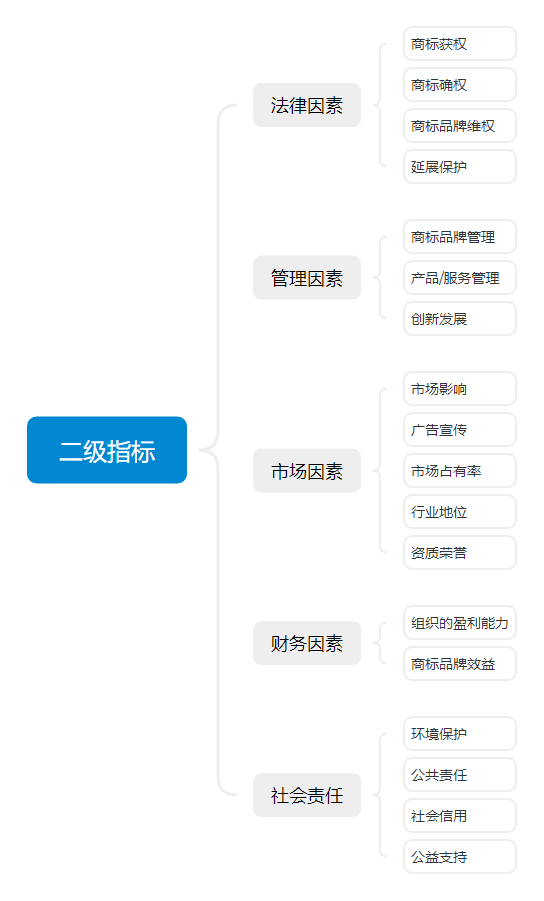 ·二級(jí)與三級(jí)指標(biāo):在一級(jí)指標(biāo)下,進(jìn)一步細(xì)分為18個(gè)二級(jí)指標(biāo)和41個(gè)三級(jí)指標(biāo),對(duì)商標(biāo)的注冊(cè)與保護(hù)情況、品牌管理制度、市場(chǎng)影響力、廣告宣傳、盈利能力、社會(huì)信用等進(jìn)行全方位、系統(tǒng)化的綜合評(píng)價(jià)。