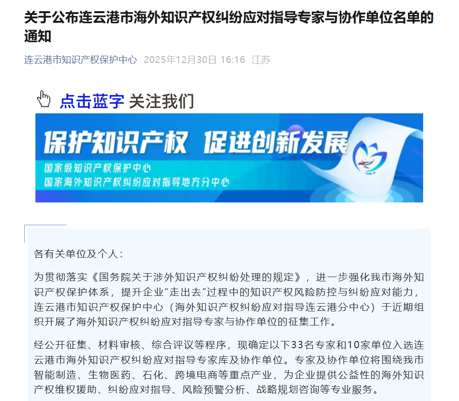 近日,連云港市知識產(chǎn)權(quán)保護中心(海外知識產(chǎn)權(quán)糾紛應(yīng)對指導(dǎo)連云港分中心)公布連云港市海外知識產(chǎn)權(quán)糾紛應(yīng)對指導(dǎo)專家?guī)炫c協(xié)作單位名單,北京三聚陽光知識產(chǎn)權(quán)代理有限公司入選連云港市海外知識產(chǎn)權(quán)糾紛應(yīng)對指導(dǎo)協(xié)作單位,張建綱總裁、高東輝副總裁、羅嘯、張婷入選連云港市海外知識產(chǎn)權(quán)糾紛應(yīng)對指導(dǎo)專家。