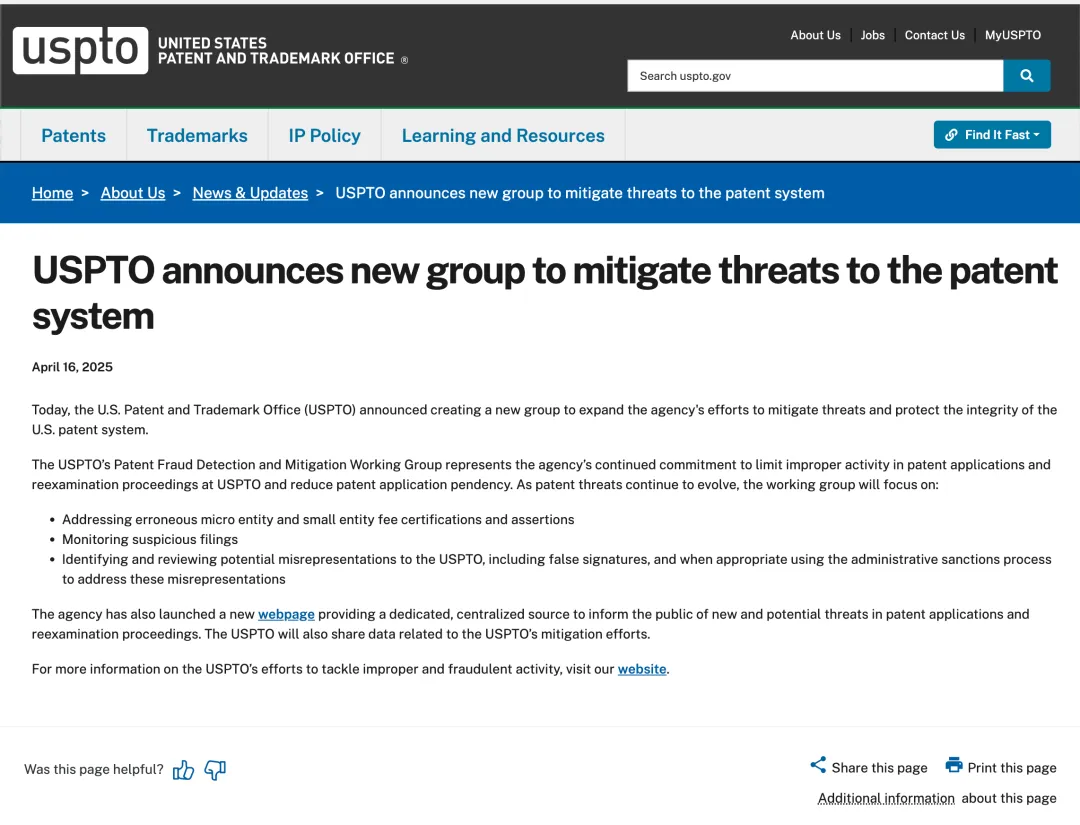 美國專利商標(biāo)局(USPTO)于2025年4月16日正式宣布成立一個(gè)全新的工作組——專利欺詐檢測(cè)和緩解工作組 (The USPTO’s Patent Fraud Detection and Mitigation Working Group)。這一舉措明確顯示了USPTO意圖加強(qiáng)對(duì)專利申請(qǐng)及復(fù)審程序中不當(dāng)行為的監(jiān)管力度,旨在維護(hù)美國專利制度的嚴(yán)肅性和公信力。