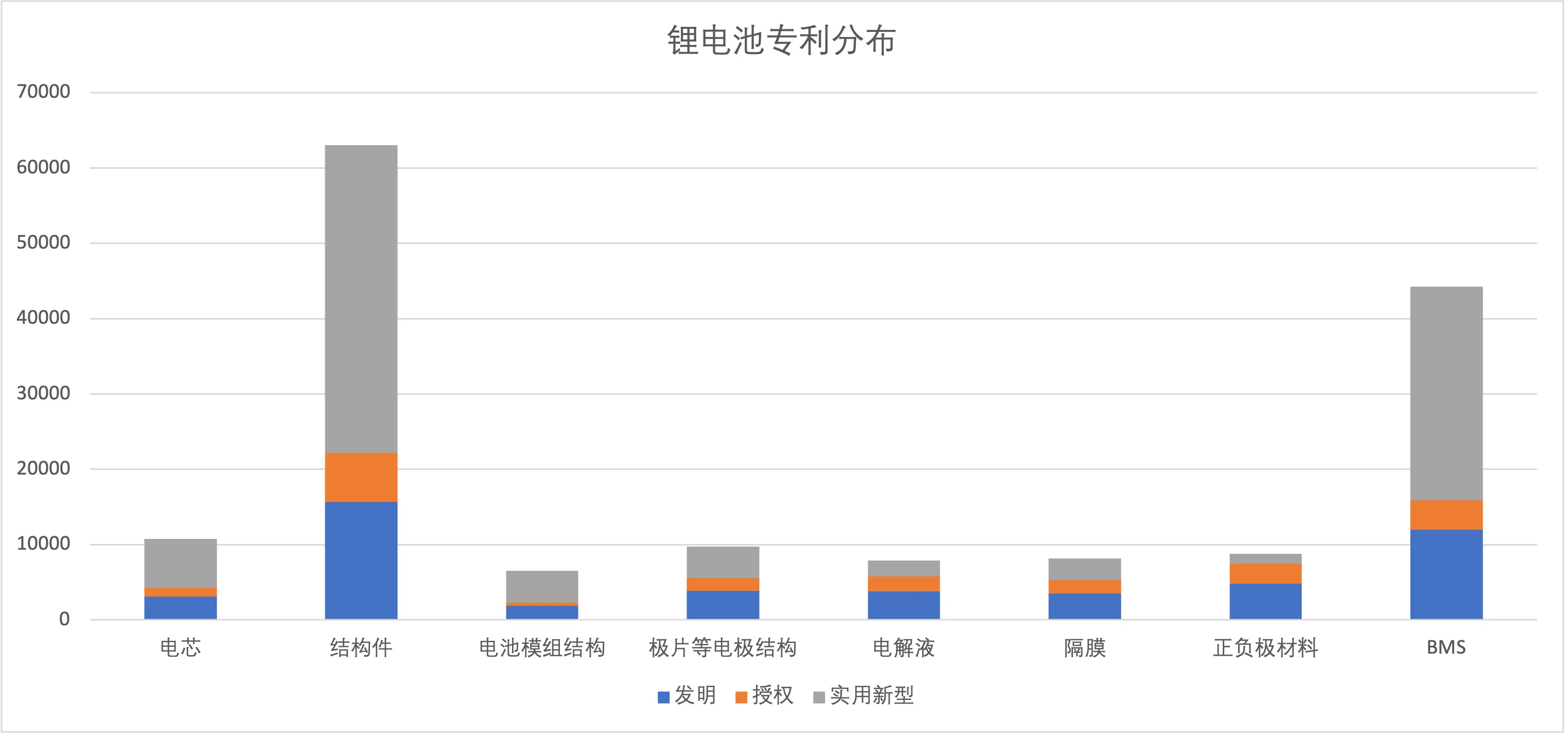 下圖是粗略檢索(未去重、未清洗)的分布結(jié)果,只為呈現(xiàn)基本的專利數(shù)量趨勢。結(jié)構(gòu)件種類多、創(chuàng)新門檻相對材料等低,是專利申請的大頭;BMS由于包含了熱管理、保護(hù)電路等,創(chuàng)新門檻同樣相對較低,所以專利數(shù)量也較多。但是動力電池的形態(tài)只有方形、軟包、圓柱,主流工藝就是卷繞和疊片,結(jié)構(gòu)件及電芯結(jié)構(gòu)專利沖突多幾乎是必然。
